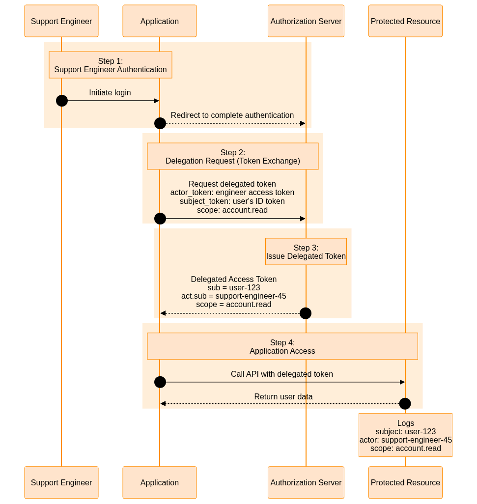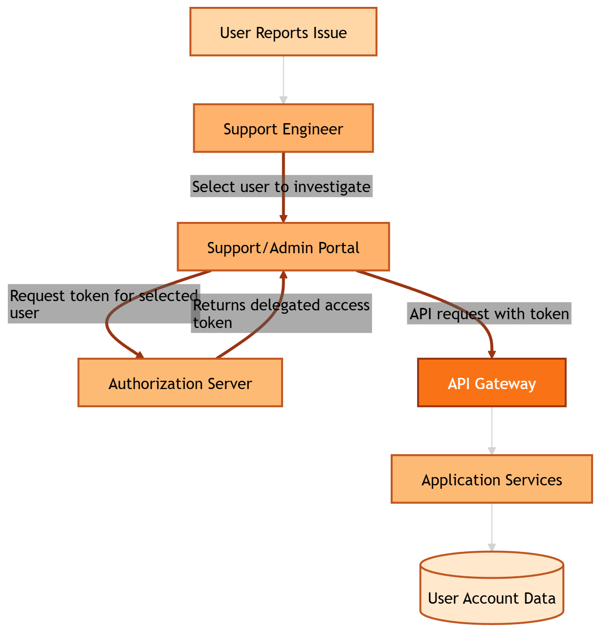 When the engineer needs to investigate a user's issue, the Application requests a delegated token via token exchange.
