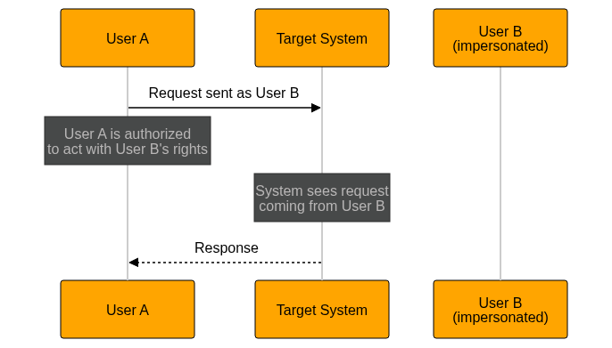 However, impersonation can also occur when a user is authorized to act with the rights of another user, so that the target system sees the impersonated user (principal) as the actor.