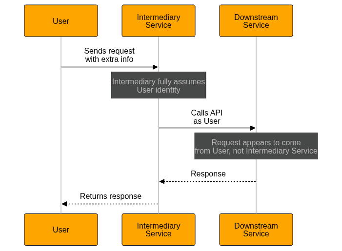 Impersonation means that the intermediary service fully assumes the identity of the user when calling downstream services. From the perspective of the downstream service the request appears to come directly from the user. The intermediary service becomes invisible in the identity chain.