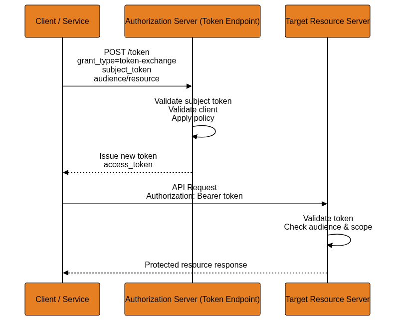 OAuth 2.0 Token Exchange is defined in RFC 8693 and introduces a standardized way for services to exchange one security token for another. Instead of forwarding the original token, a service can request a new token specifically scoped for a downstream service.